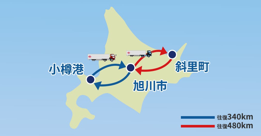 北海道内では往復800kmを超える輸送もあり、乗務員の拘束時間の観点から、2台のヘッドを活用したドッキング輸送を実施しております。